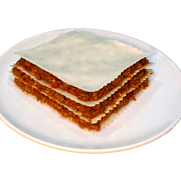 La auténtica boloñesa con las mejores carnes magras de ternera y cerdo cocinada a fuego lento con un sofrito de tomate, cebolla y hortalizas en aceite de oliva intercalada con finas capas de pasta fresca de gran calidad bañada con una cremosa bechamel artesana y gratinada con queso rallado.